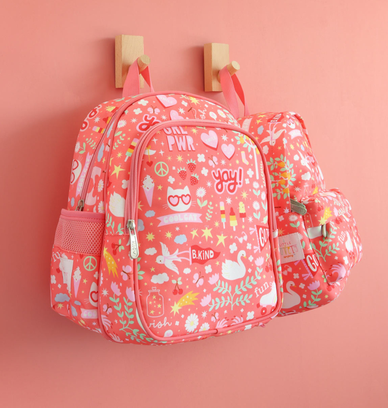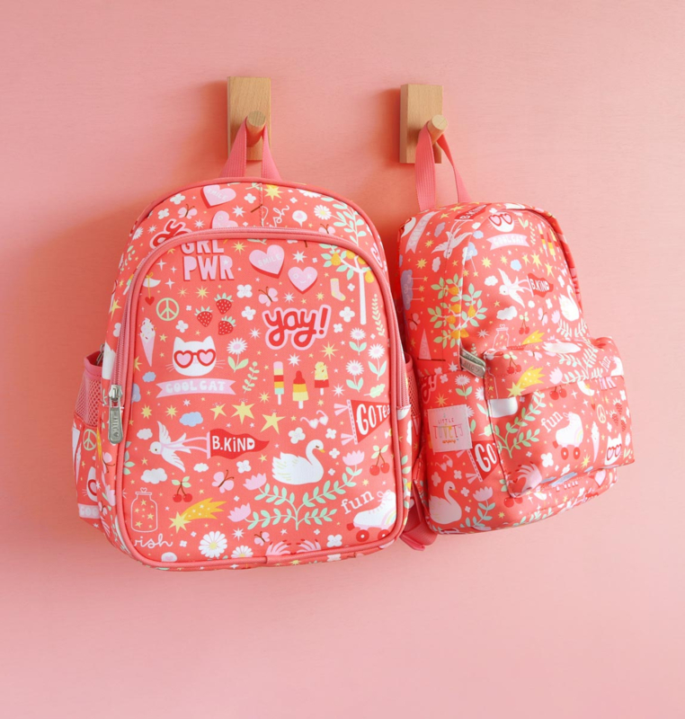 OverzichtDeze handige, roze rugzak met vrolijke print is ideaal om mee te nemen naar school of op reis. De kinderrugzak van A Little Lovely Company heeft een ruim hoofdcompartiment, een geïsoleerd voorvak en twee open zijvakken; groot genoeg voor een broodtrommel, een snacktrommel en een drinkfles.