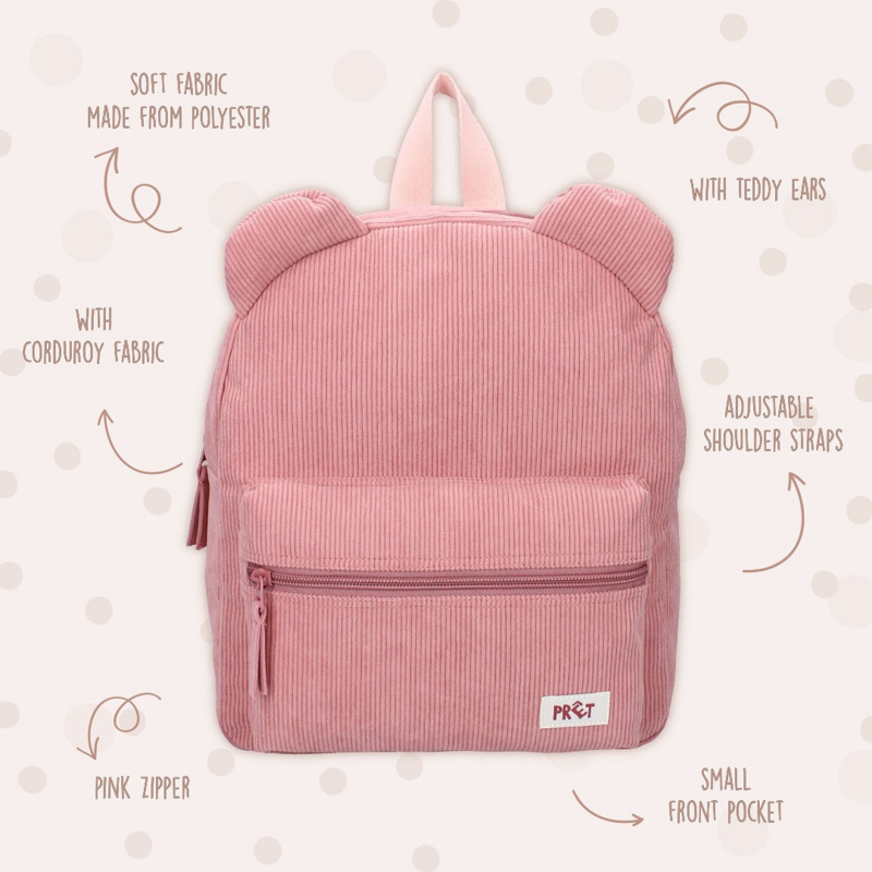Deze trendy rugzak van Prêt komt uit de ‘Ridge And Row’ collectie en is een echte must-have! De roze tas is gemaakt van zachte ribstof en biedt voldoende ruimte voor alle dagelijkse spulletjes. Het hoofdvak is afgewerkt met schattige berenoortjes en sluit, net als het voorvak, met een stevige ritssluiting.