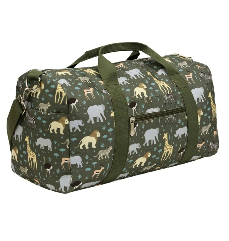 Deze ruime, grijze weekendtas met savanne dieren is ideaal om mee te nemen op vakantie, naar logeerpartijtjes of als sporttas. De tas is ook geschikt als handbagage, check hiervoor wel altijd eerst de richtlijnen van de luchtvaartmaatschappij.