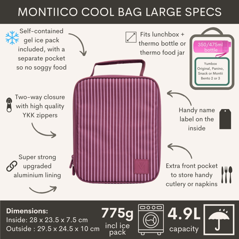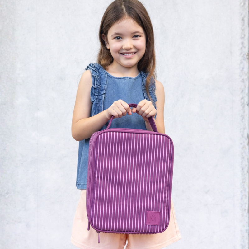 Houd je lunch vers én gekoeld met deze koeltas van MontiiCo. Deze lunchtas met streep in de kleuren burgundy met roze is een feestje voor het oog, maar ook nog eens erg praktisch.