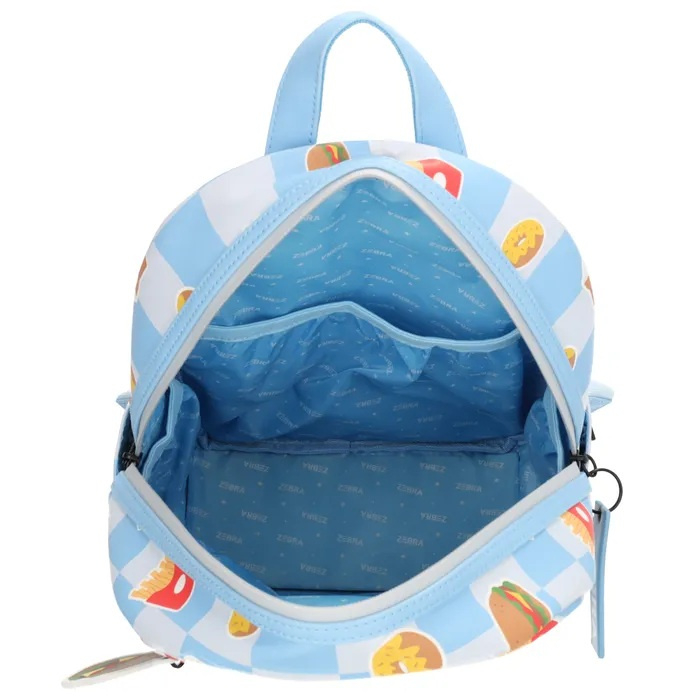 De tas heeft een ruim hoofdvak met ritssluiting waarin je eenvoudig je schoolspullen, lunch en andere essentials kunt opbergen. Aan de voorkant zit een extra ritsvak voor spullen die je snel bij de hand wilt hebben. De sleutelhanger in de vorm van een hamburger maakt de tas natuurlijk helemaal af!