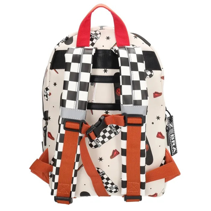 OverzichtRugzak Levi van ZEBRA is een trendy en praktische tas voor kinderen die graag een vrolijke rugzak mee willen nemen. Of je 'm mee naar school neemt, of als je een dagje uit gaat, deze toffe rugzak springt altijd in het oog! De rugzak is offwhite en heeft een toffe print met skateboards, gympen en sterretjes in het wit, zwart en rood.