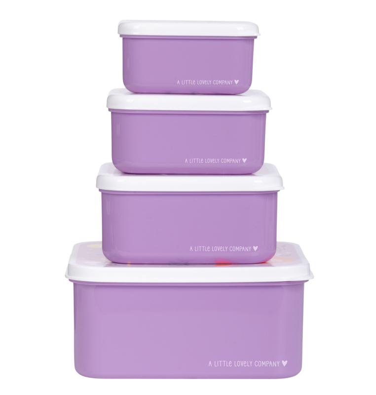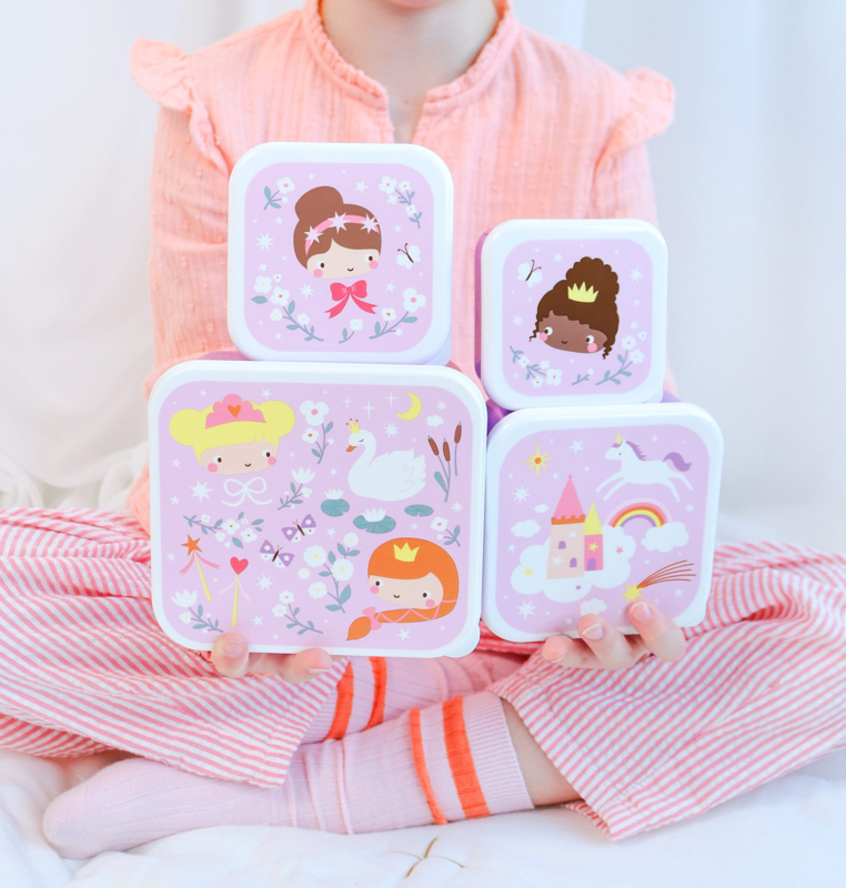OverzichtDeze geweldig leuke set lunch- en snackboxen van A Little Lovely Company bestaat uit vier verschillende formaten met allemaal hun eigen print met prinsessen en andere leuke afbeeldingen.
