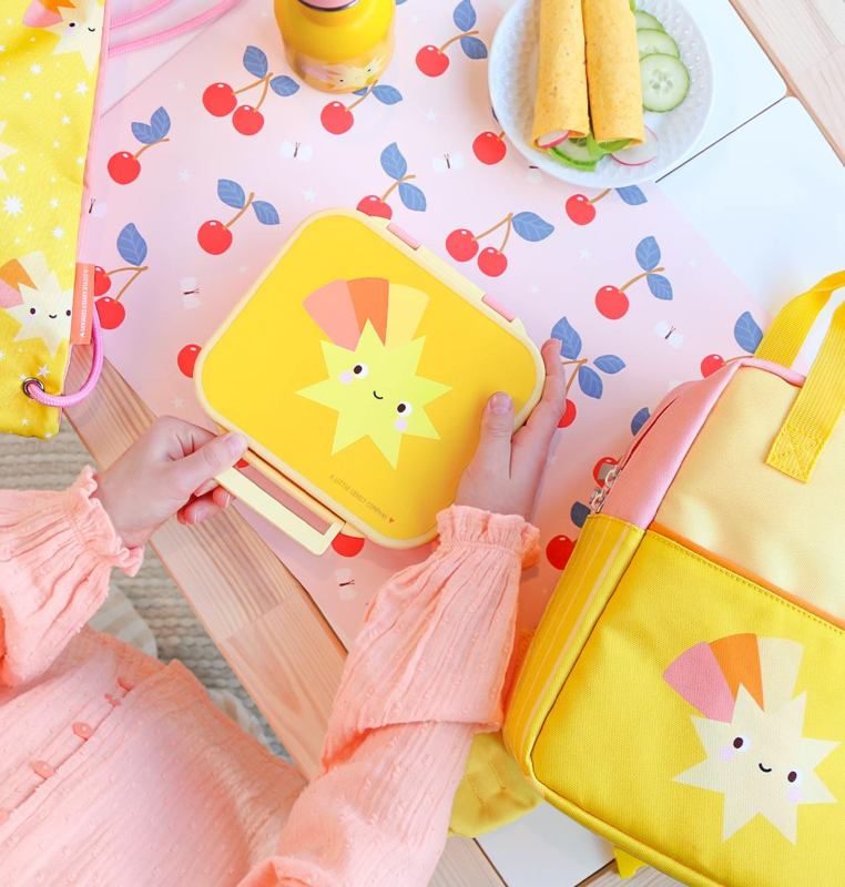Lunch in stijl met deze vrolijk gekleurde lunchbox uit de mini collectie van A Little Lovely Company. De lunchbox is roze en het deksel is geel. Op het deksel wordt een vallende ster afgebeeld.