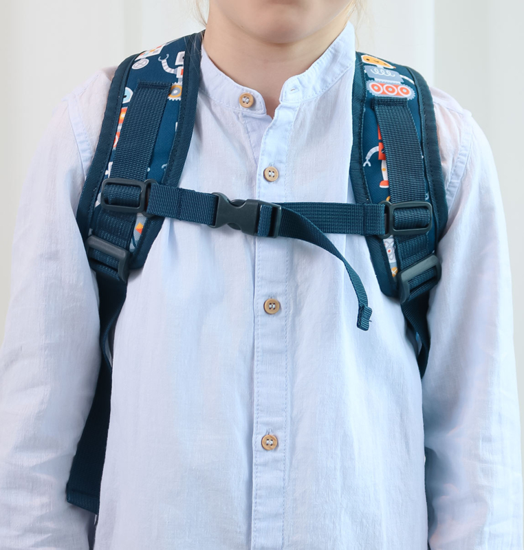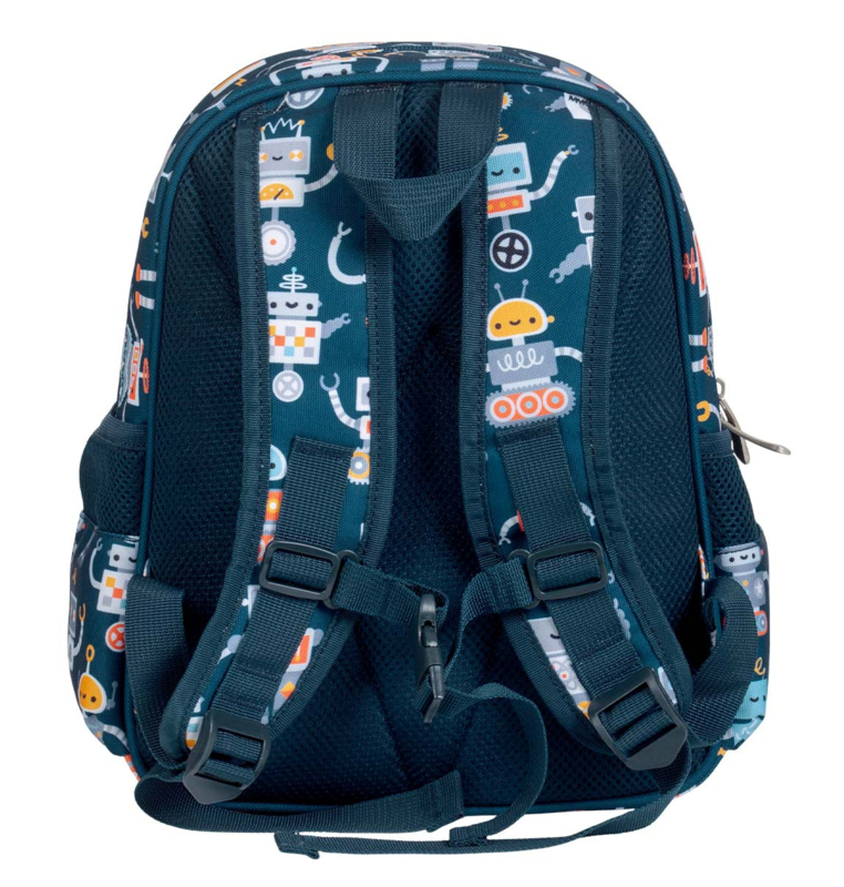 Deze handige, donkerblauwe rugzak met stoere robotprint is ideaal om mee te nemen naar school of op reis. De kinderrugzak van A Little Lovely Company heeft een ruim hoofdcompartiment, een geïsoleerd voorvak en twee open zijvakken; groot genoeg voor een broodtrommel, een snacktrommel en een drinkfles.