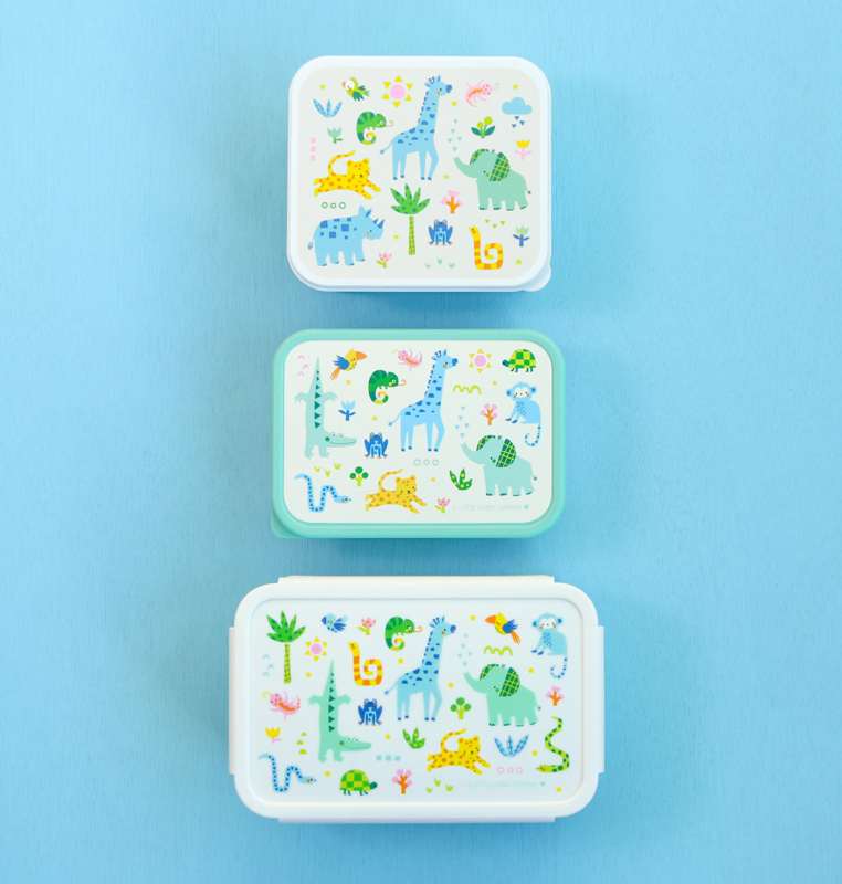 Deze geweldig leuke set lunch- en snackboxen van A Little Lovely Company bestaat uit vier verschillende formaten met allemaal hun eigen print met vrolijke jungledieren.