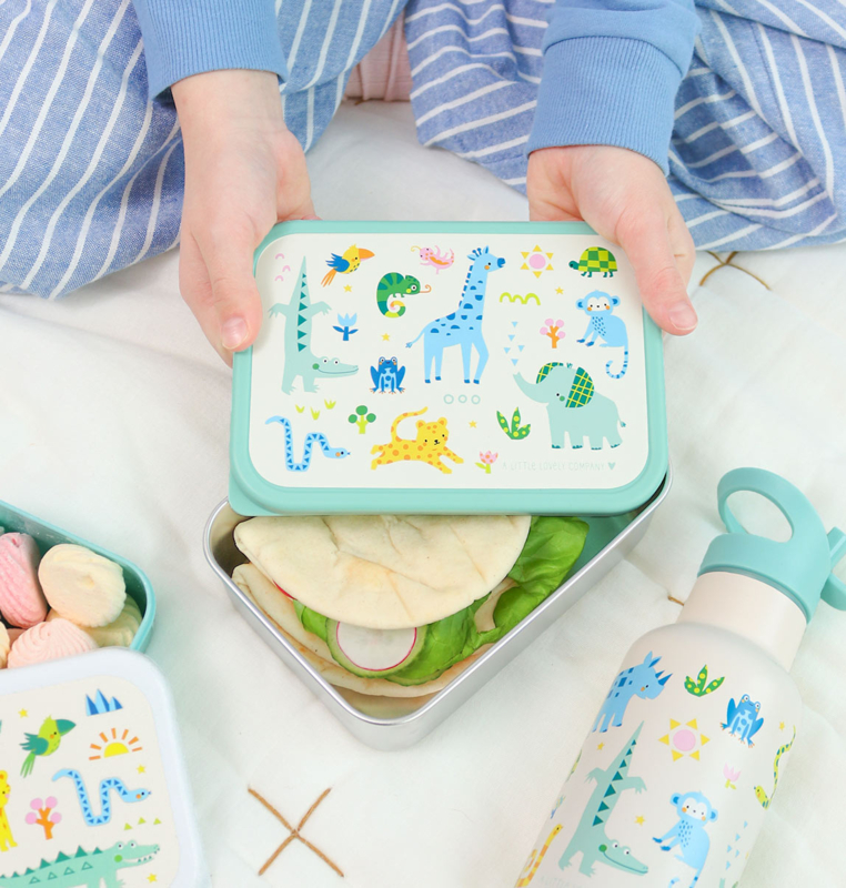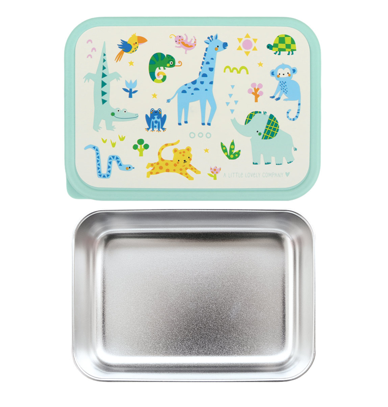 Deze lichtgewicht, duurzame lunchbox van A Little Lovely Company is gemaakt van stevig roestvrijstaal. Perfect voor een paar lekkere boterhammen! Het deksel heeft een vrolijke jungleprint en is gemaakt van PP. Hierdoor is de lunchbox ook voor jonge kinderen met kleine handjes gemakkelijk te openen en sluiten.