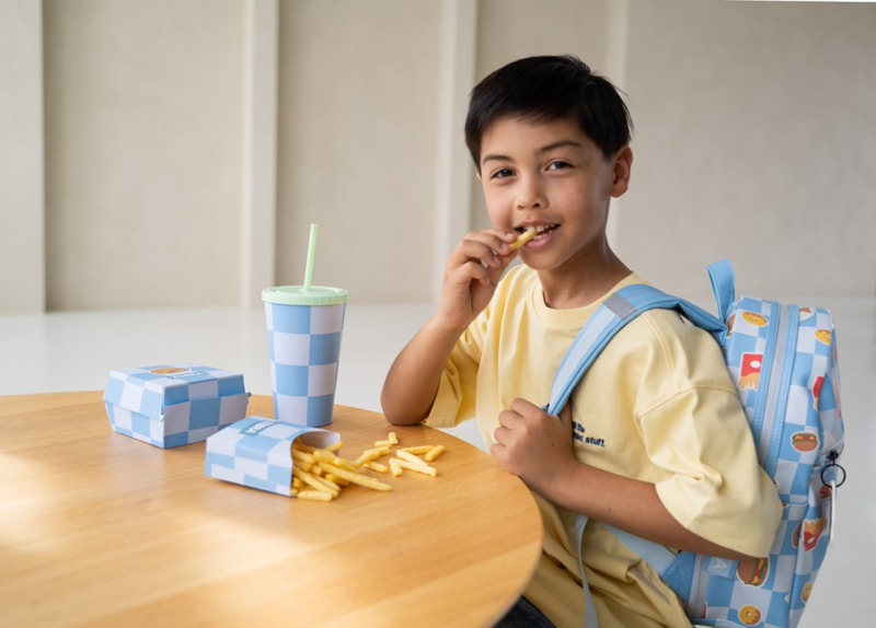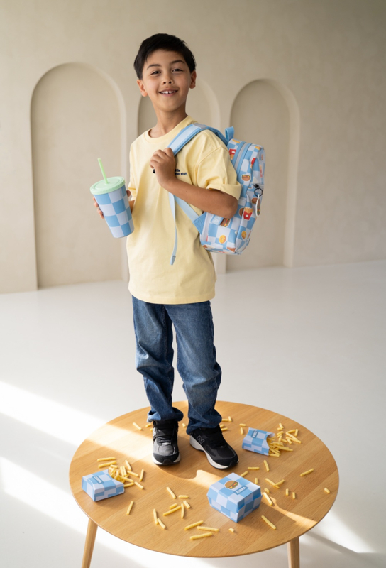De tas heeft een ruim hoofdvak met ritssluiting waarin je eenvoudig je schoolspullen, lunch en andere essentials kunt opbergen. Aan de voorkant zit een extra ritsvak voor spullen die je snel bij de hand wilt hebben. De sleutelhanger in de vorm van een hamburger maakt de tas natuurlijk helemaal af!