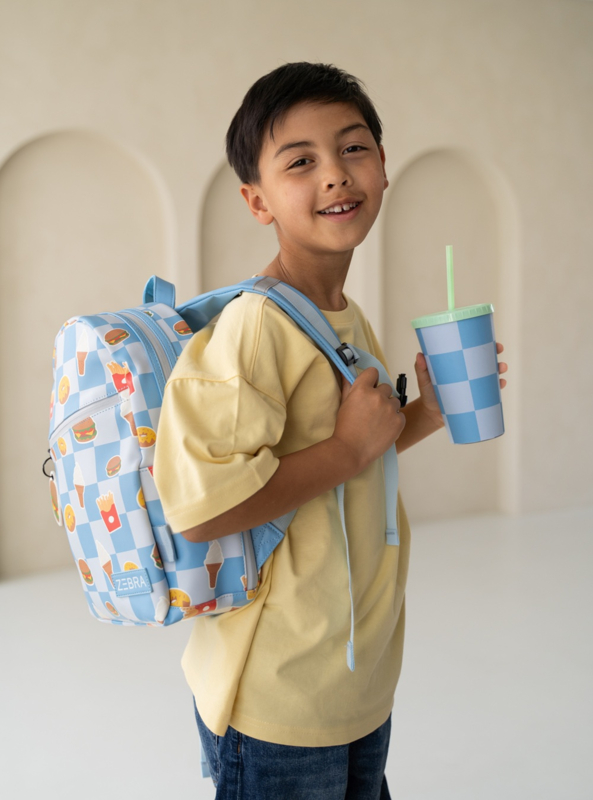 OverzichtRugzak Levi van ZEBRA is een trendy en praktische tas voor kinderen die graag een vrolijke rugzak mee willen nemen. Of je 'm mee naar school neemt, of als je een dagje uit gaat, deze toffe rugzak springt altijd in het oog! De rugzak is lichtblauw/wit geblokt en heeft een toffe fast food print met hamburgers, frietjes, donuts en ijsjes.