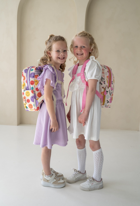 De rugzak heeft verstelbare schouderbanden die aan de voorkant met een klikgesp vastgezet kunnen worden, zodat de tas comfortabel en stevig blijft zitten. Op de achterkant vind je een naamkaartje, handig om zo te laten weten dat deze leukerd van jou is!