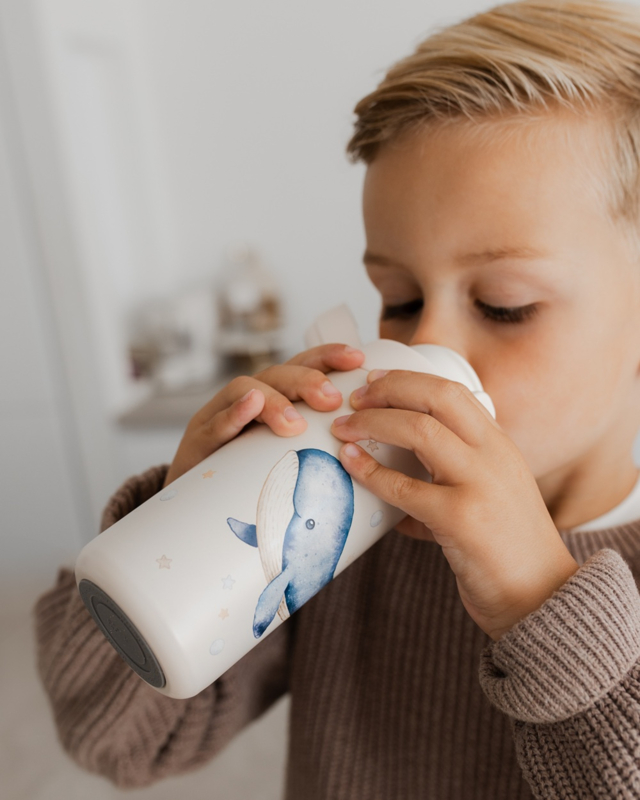 Een schattige walvis, kijkend naar de sterren... Deze drinkfles van Petit Monkey is niet alleen leuk, maar ook nog eens erg handig in gebruik.